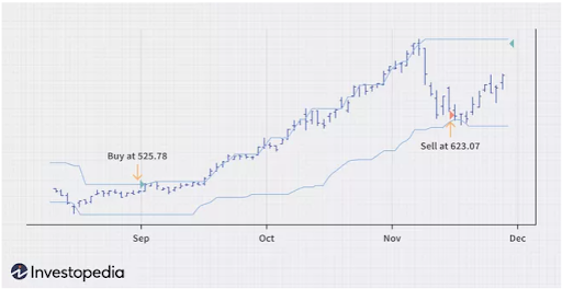 The price movement above the upper band represents a sell signal and below the lower bar shows a buy signal.